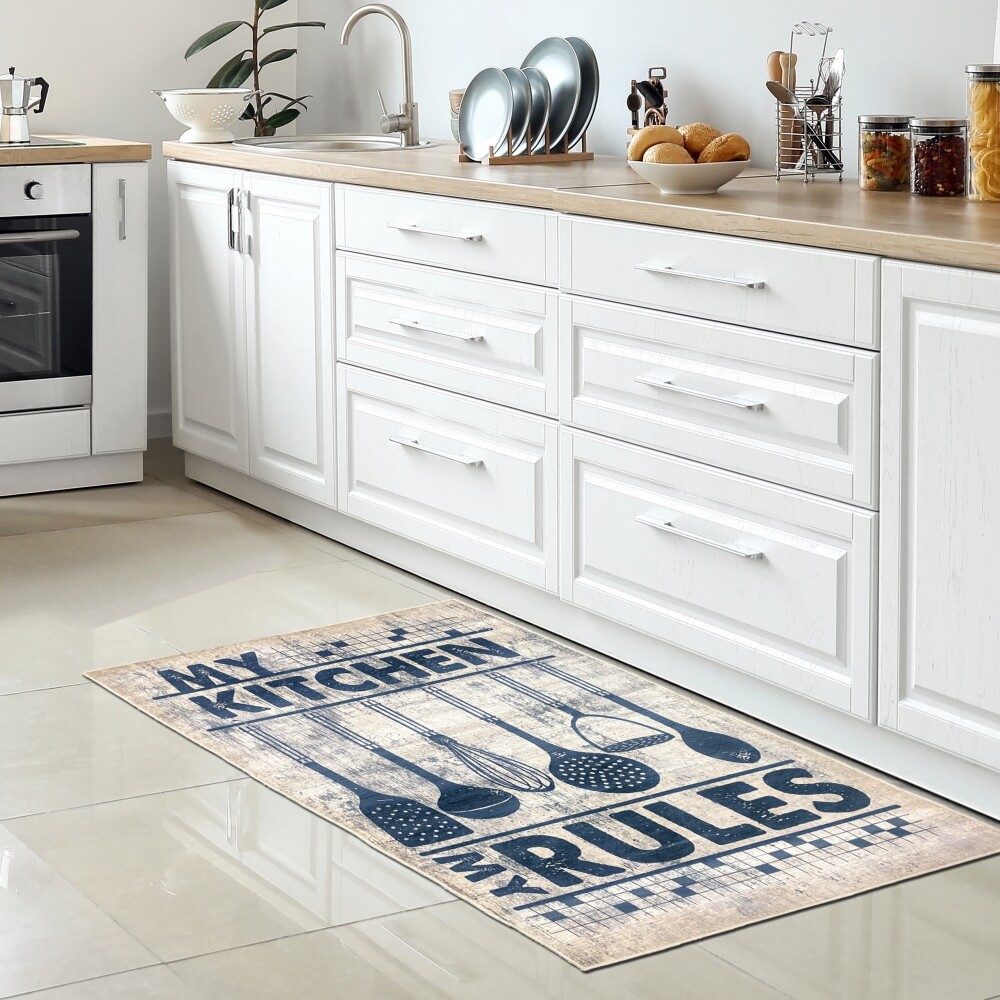 Tapis de cuisine I dos en gel antidérapant I lavable I cuillères de cuisine et épices colorées. La couleur beige neutre s'adapte à presque tous les styles d'intérieur et le dos en gel du tapis garantit qu'il reste antidérapant sur les sols lisses, ce qui est un aspect important de la sécurité dans la cuisine.