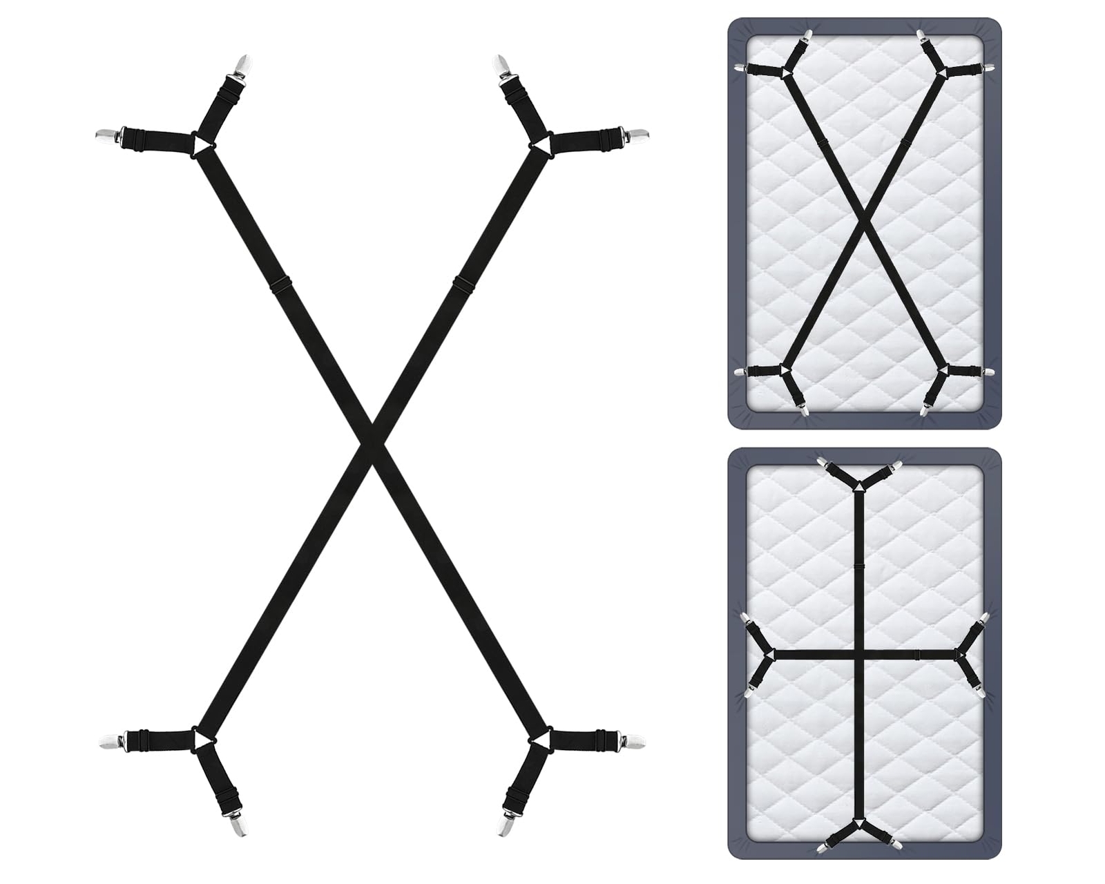 ●Gardez vos draps bien rangés - Les supports de draps ont des pinces chromées robustes et une structure élastique triangulaire triangulaire stable qui maintiennent les draps fermement aux quatre coins du matelas et du cadre de lit. Ainsi, les draps s'adaptent bien au matelas et restent plats pour améliorer le confort de sommeil et vous assurer que vous pouvez dormir paisiblement Protégez les draps et le tissu - Les supports de drap-housse disposent d'un système de boucle en plastique intégré pour protéger le tissu contre les dommages. Les clips en plastique ondulés sur l'ourlet du lit maintiennent les draps fermement et protègent bien le tissu.