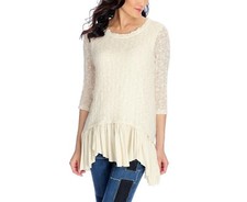 Has a thermal look to it. Material is very soft and stretchy. Has an intentional destressed look to it (ie lose threads are intenional). Looks great with jeans. Flat measurements: About 21 inches from armpit to armpit. Shirt is about 22 inches long in the front and about 27 inches long in the back.