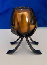 Beau bougeoir photophore sur pied rond orné de frises feuillagées en métal lourd initialement doré, surmonté d'un globe forme tulipe en verre vert avec liseré doré. Dimensions : 29,6 x 12 cm. Poids : 601 g. Usure de la dorure sur le pied, laissant un aspect similaire à l'étain. Traces d'oxydation vert-de-gris, essentiellement sur le pas de vis sous le pied. Liseré doré estompé sur le verre.