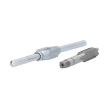 Jeu de tarauds filetés à tige MT3 support de robinetterie arrière de tour boîte en bois MTI. Pour les fils plus grands qui ne peuvent pas être tenus à la main, une poignée d'arrêt qui porte contre le chariot du tour empêche la rotation lorsque les fils sont coupés.
