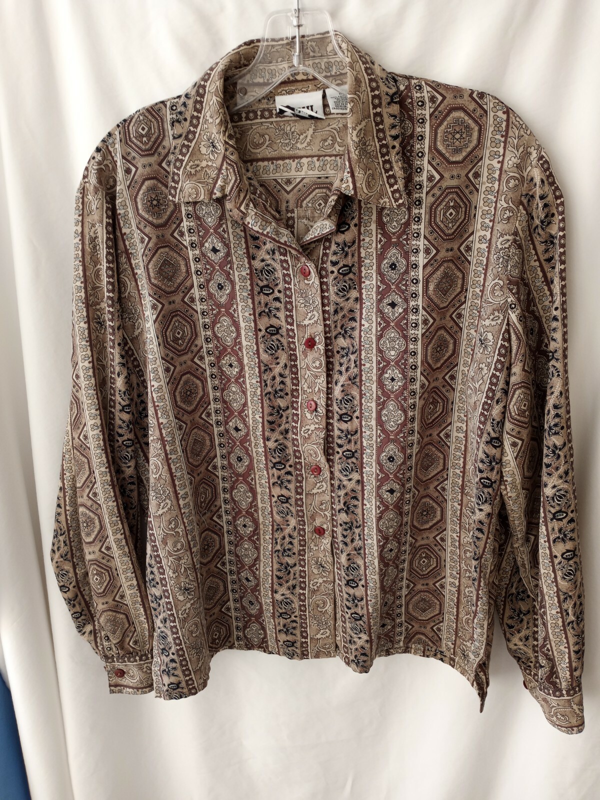 Women's EHL Petite top blouse shirt button up size 12 ( bust measures 21 1/2 inches pit to pit) length measured from bottom of collar to hemline is 24 1/2 inches. Hemline is the untucked style. Polyester browns & tan geometric design in vertical columns. EXCELLENT Condition NO flaws. "Pre-owned". Shipped with USPS First Class.