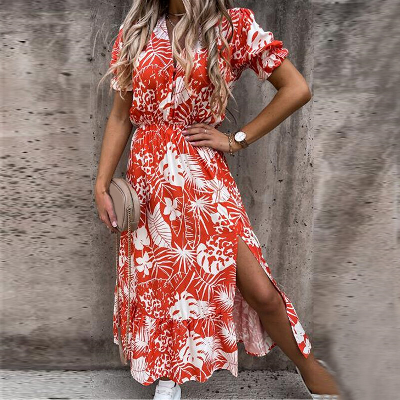 Robe Mi-Longue Florale Style Boho Col En V Manches Courtes Tenue D'été Pour /