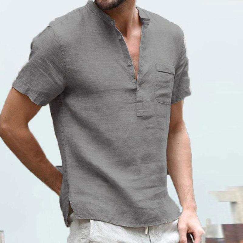 Chemises Solides En Coton Et Lin À Manches Courtes Pour Hommes T-Shirt Slim /