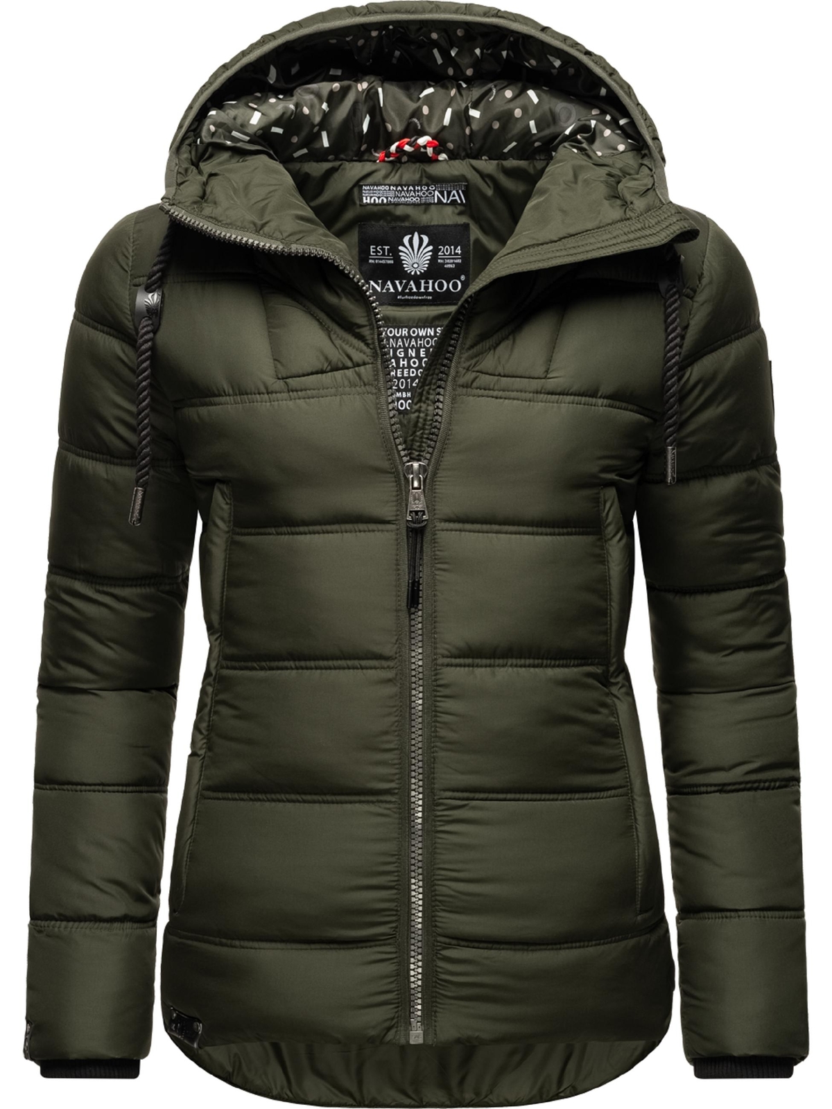 LOOK : Veste matelassée d'hiver chaude et ajustée de Navahoo en matériau extérieur super doux et avec de grands cordons tendance - un véritable favori en hiver ! MATÉRIEL : Veste d'extérieur en matériau extérieur mat chatoyant et hydrofuge (toucher doux) et doublure intérieure douce et soyeuse avec un motif imprimé ludique, très agréable à porter COUPE : Veste matelassée pour femme avec une coupe cintrée et un matelassage étroit et peu volumineux. La veste est coupée plus longue dans le dos et s'étend sur le bas pour que le dos soit toujours couvert et chaud.
