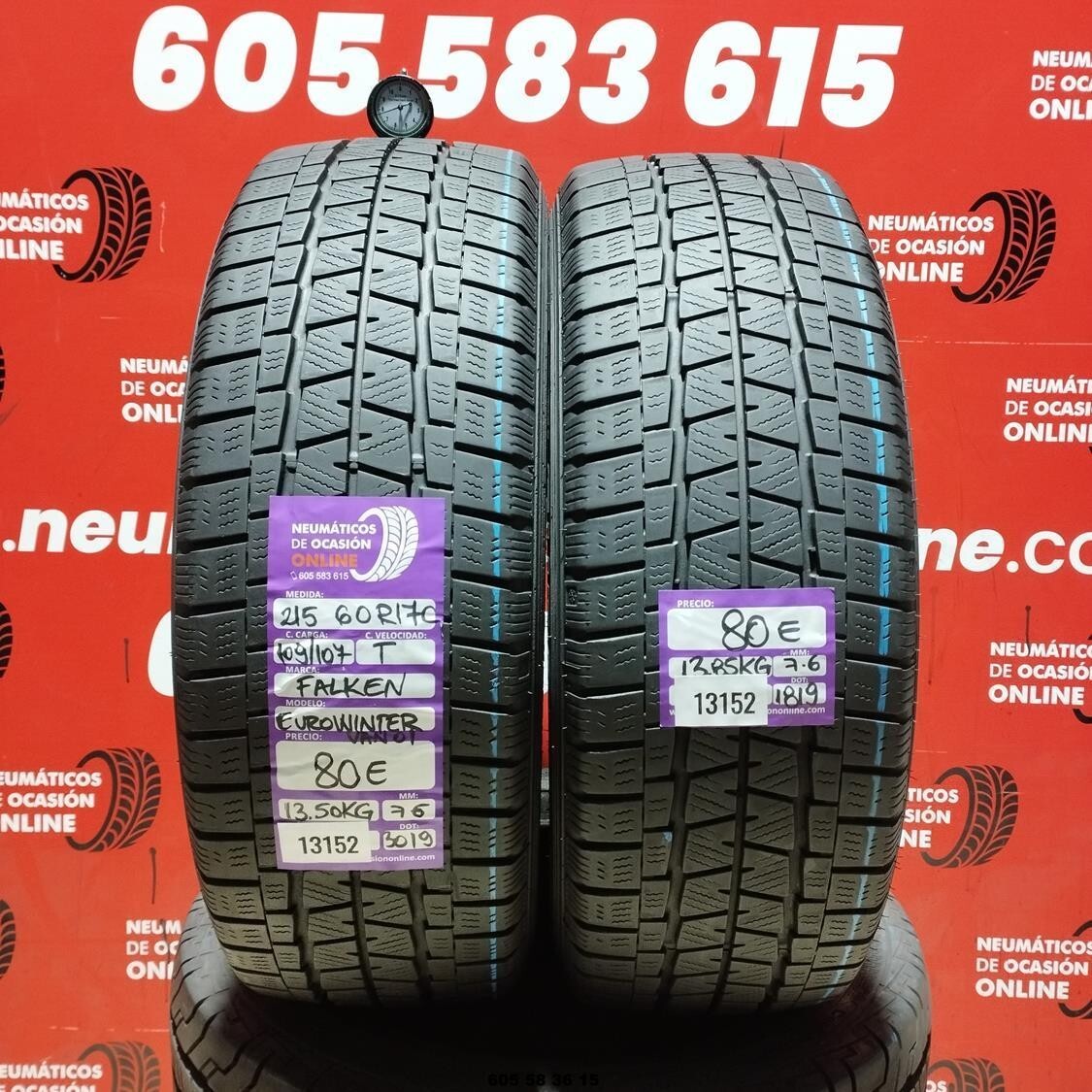 2x 215 60 R17C 109/107T FALKEN EUROWINTER 7,5/7,6mm REF:13152 VENTE UNIQUEMENT PAR PAIRE (le prix annoncé est pour la paire totale, le prix autocollant pour l'unité). Veuillez noter qu'il s'agit de produits d'occasion, alors assurez-vous que vous êtes satisfait de l'état du produit et du DOT. Assurez-vous également que le produit acheté est de la taille, du code de charge et de vitesse dont vous avez besoin. Vous pouvez le vérifier dans la fiche technique de votre véhicule. Montage et équilibrage gratuits UNIQUEMENT dans nos ateliers de Séville. Regardez bien, dans chaque publicité, les millimètres et le DOT de chacun des pneus. Nous ne livrons pas aux îles Canaries, Ceuta, Melilla ou les îles Baléares, ni vers d'autres îles européennes. *DOT fait référence à la semaine et à l'année d.