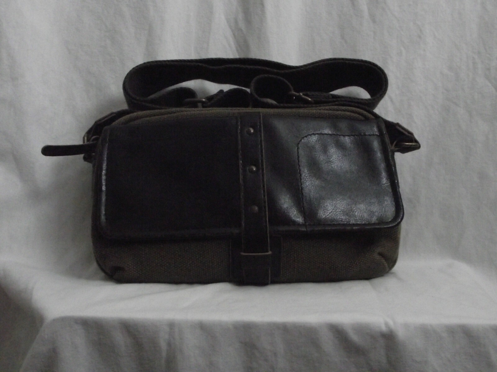 Pochette à rabat cuir sur la face avant. Bandoulière en tissu réglable.