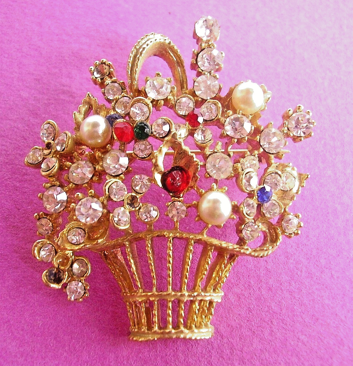 "PANIER DE FLEURS". 5,4 CM X 4,6 CM. EN MÉTAL DORÉ. ACCOMPAGN É DE MULTIPLES STRASS.