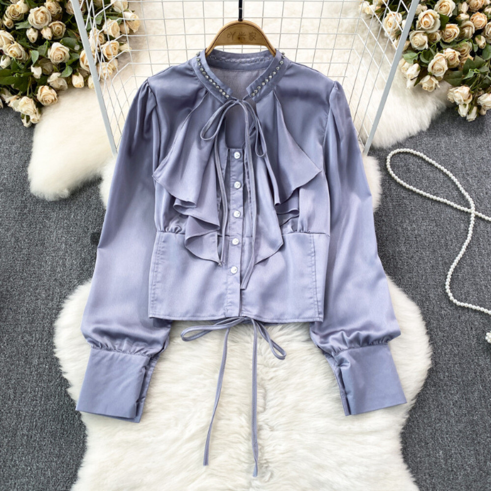 Femme Satin Ruffles Chemisier Haut Chemises Décontracté Habillé Faux Soie Rétro