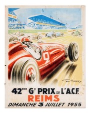 affiche : voiture de course ancienne, ravitaillement en eau et en essence