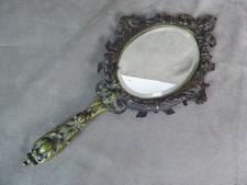Ancien miroir face à main en bronze Laiton Doré Ange Déco Beauté. Bel état Je signale des traces de colle à l’arrière au niveau du miroir voir photos Longueur 30,5cm Idéal collection Plus d’infos sur demande