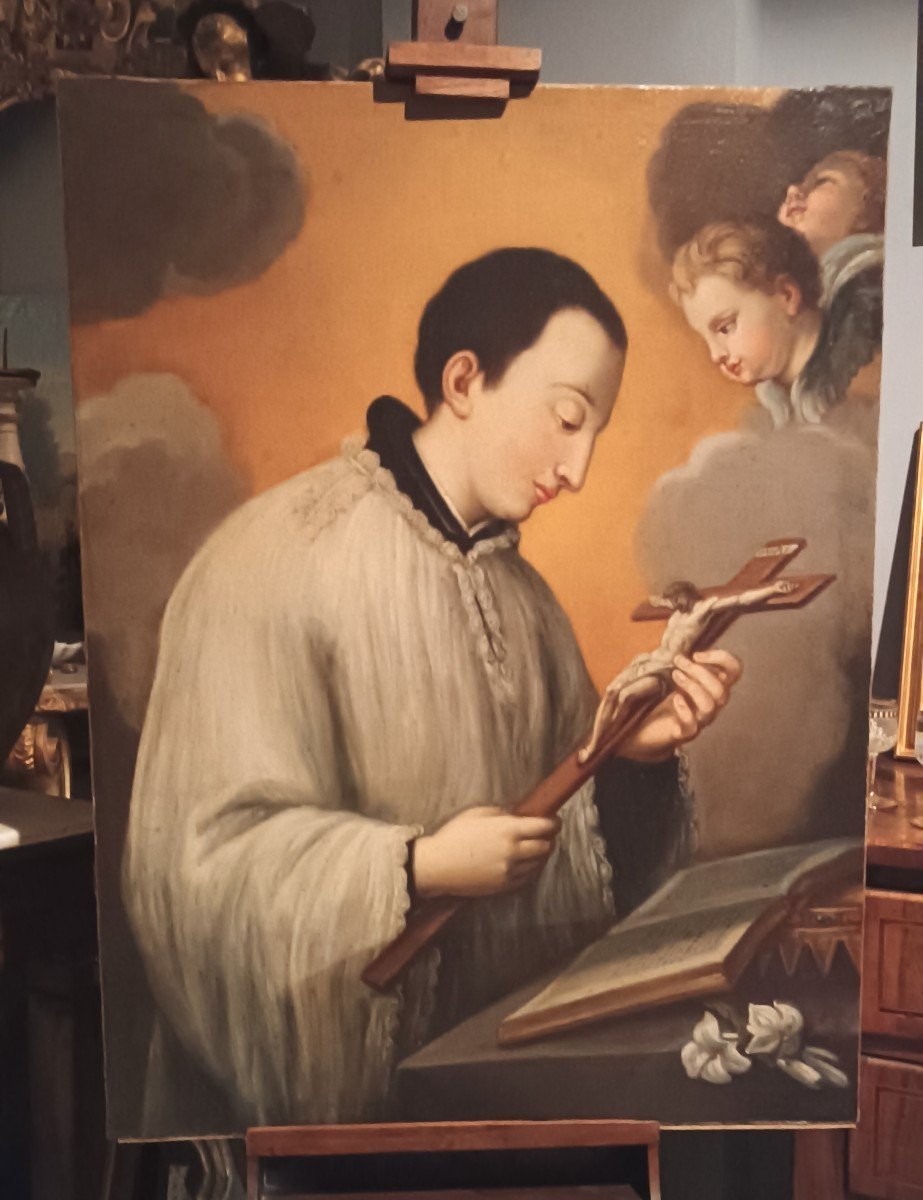 Grande peinture à l'huile sur toile représentant San Luigi Gonzaga avec un crucifix, des lys et des putti. Ecole toscane seconde moitié du XVIIIe siècle Excellent état, a un regarnissage, pas de restaurations picturales significatives - taille 97 cm x63 cm