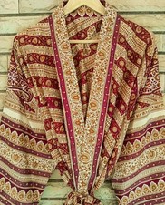 Taillés dans des saris en pure soie vintage, ce sont des robes fluides ouvertes sur le devant, chacune dans un motif différent et unique. C'est la robe parfaite à porter comme cape, comme dissimulation, comme robe de nuit, ou même simplement pour se détendre pendant une journée détendue à la maison. Oh, et oui, c'est aussi le cadeau PARFAIT - que vous recherchiez votre amie, votre mère, votre grand-mère ou même vous-même !!! La soie est une fibre naturelle et donc très délicate. Il varie également en épaisseur et en cohérence. Bien que tous mes kimonos soient faits de soie solide et tombent bien, certains peuvent être un peu translucides tandis que d'autres peuvent être totalement opaques. J'utilise aussi parfois la soie de crêpe ou la soie en satin, car ces tissus drapent comme un rêve. S.