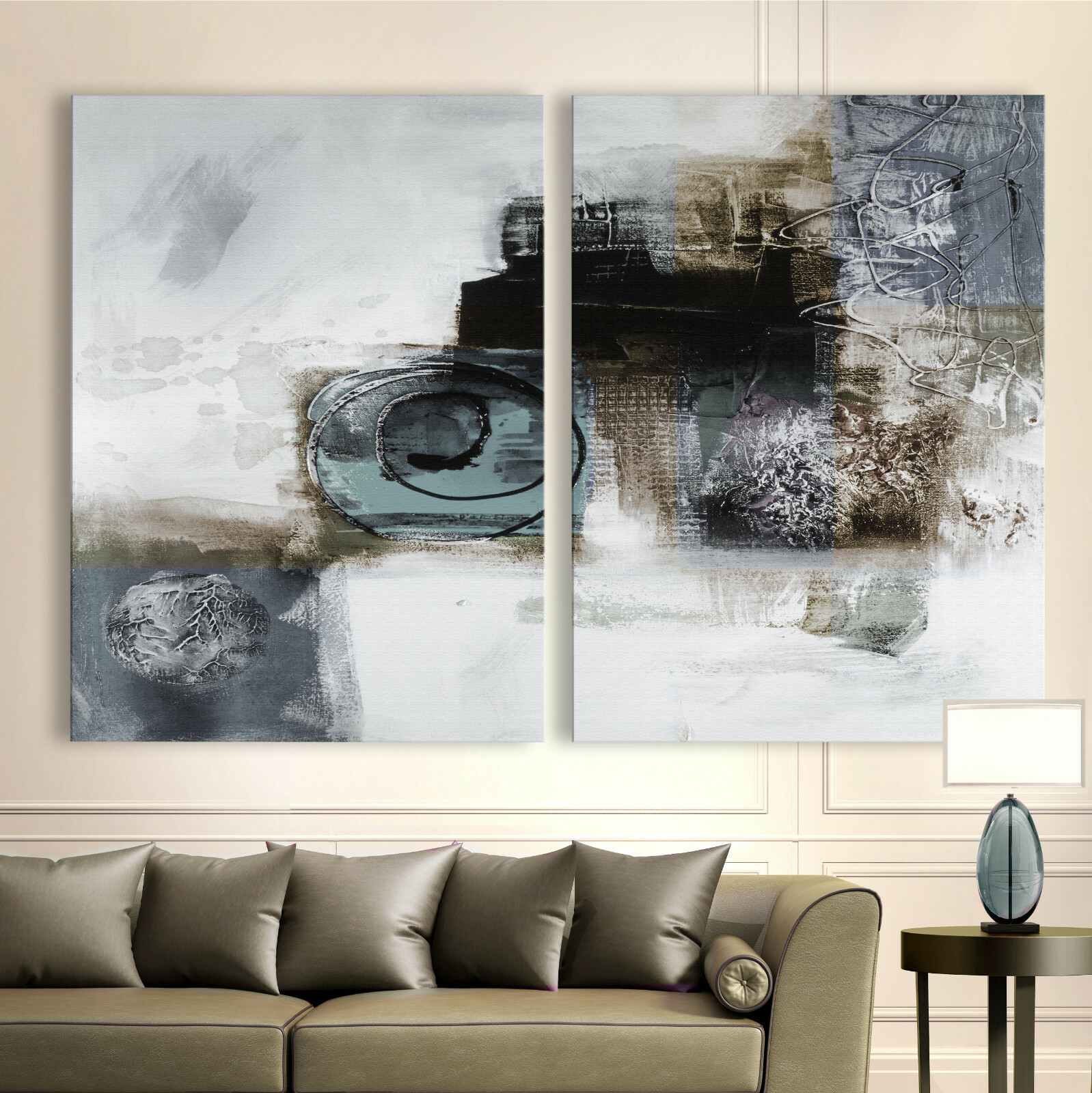 ABSTRAIT - FINE ART PRINT - Impressions d'art de haute qualité sur toile véritable, avec toile. Encadrement en bois. or Élevé avec soin et à la main. Prêt à accrocher. Images sur toile de la meilleure qualité. Signé et daté au dos. ENSEMBLE D'IMAGES exclusif dans les tons gris-bleu. 2 parties de 70 x 100 cm chacune. Image globale 145 x 80 cm (avec un écart d'environ 5 cm). Livraison gratuite en Allemagne Merci pour ton intérêt.