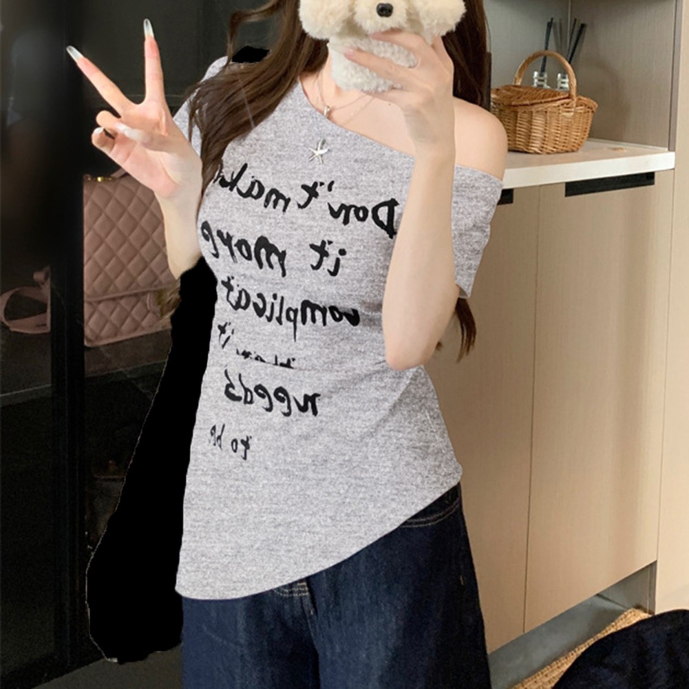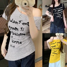 Tshirt femme imprimé lettre épaules dénudées manches courtes coupe slim déc