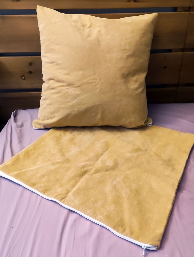1 paire de housses de coussin 45x45, couleur jaune moutard. Lavé, mais jamais utilisé. Waterproof, idéal si vous avez des animaux à la maison.