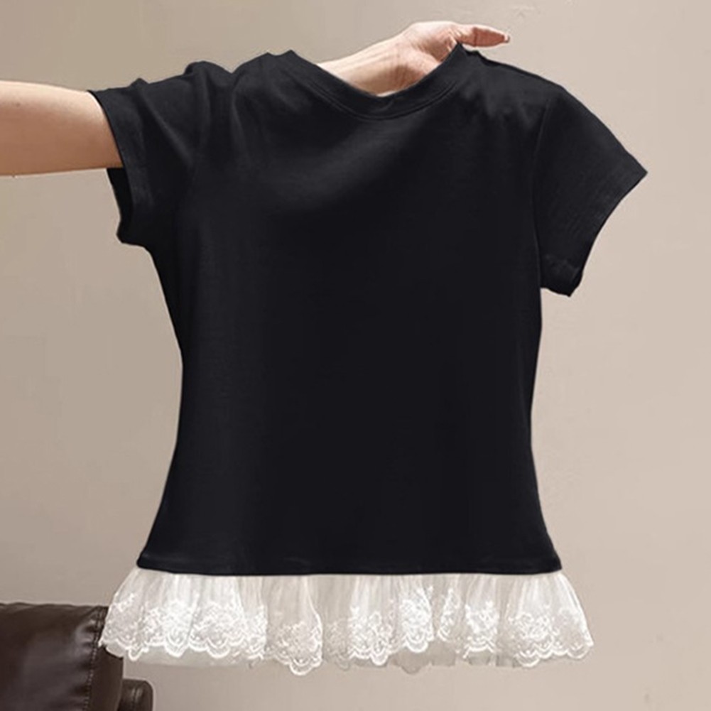 Charmant t shirt femme manches courtes avec dentelle col rond pour look quotidie