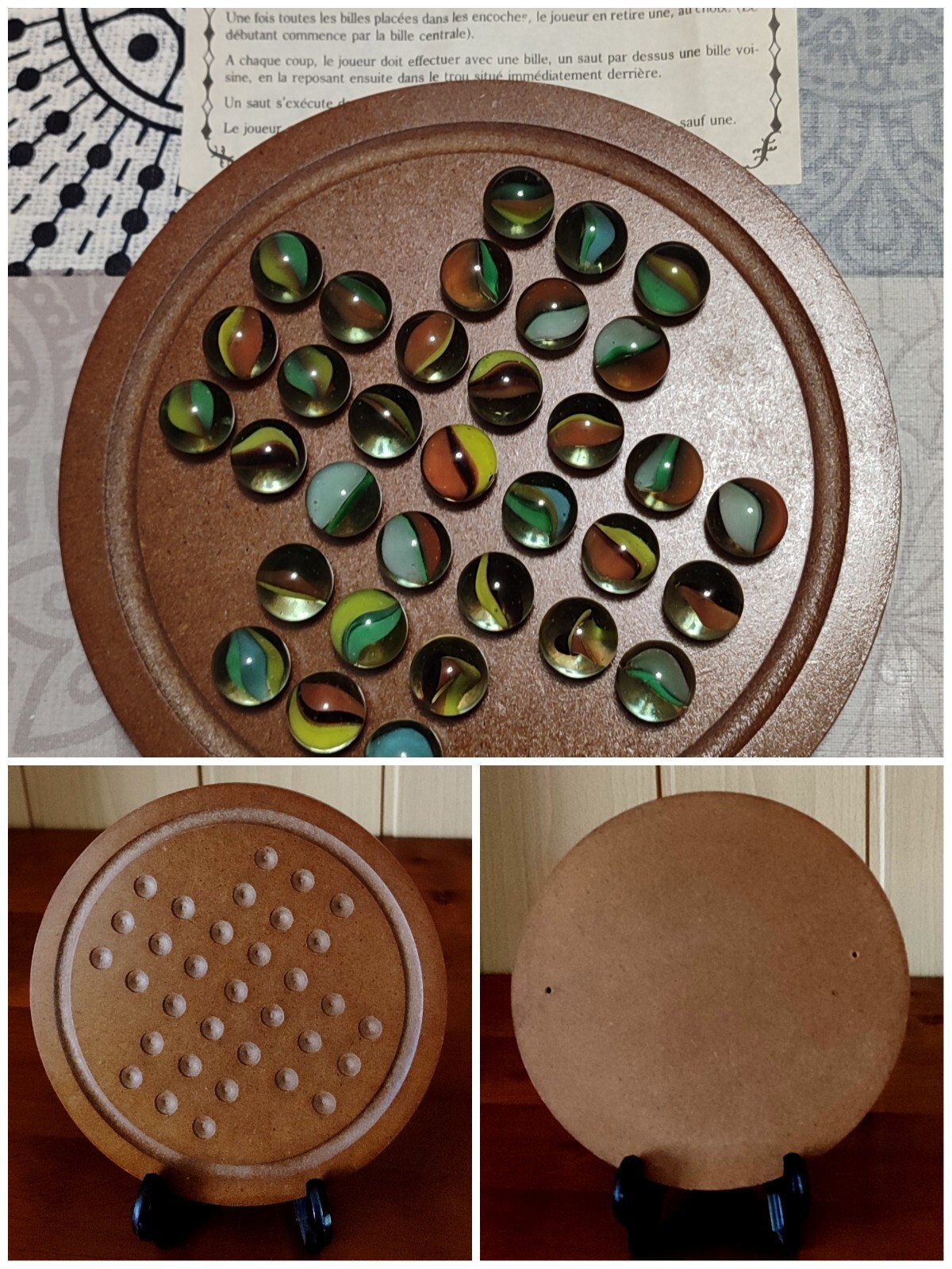 JEU DE SOLITAIRE + NOTICE PLATEAU BOIS ∅ 18 CM - COMPLET 33 BILLES DE VERRE -TBE