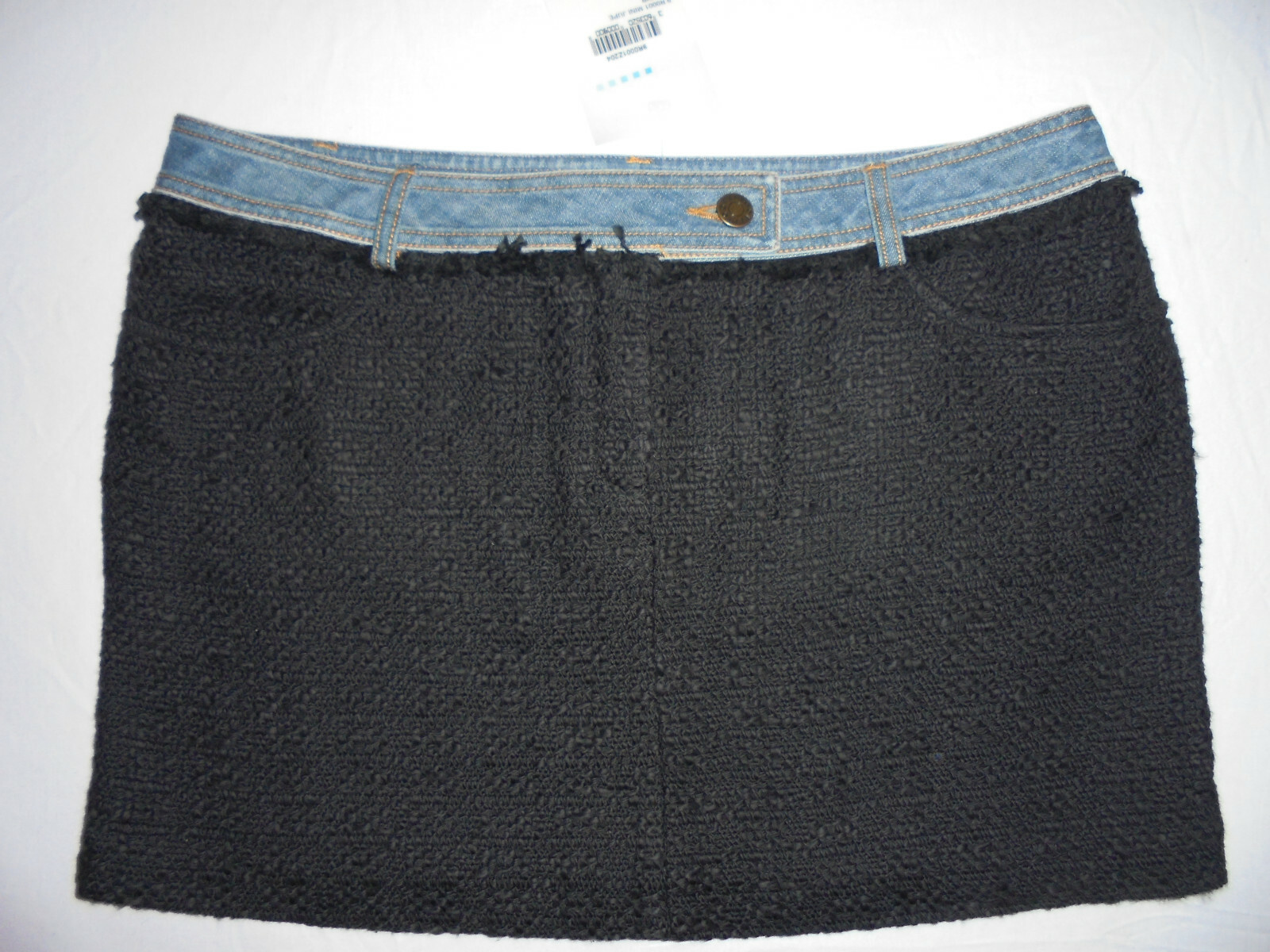 Composée de 2 matières (tweed noir et jean). Très jolie jupe. Passants pour ceinture (en jean). NEUVE avec étiquette. Doublure noire en acétate. Largeur (hanches) :48 cm.