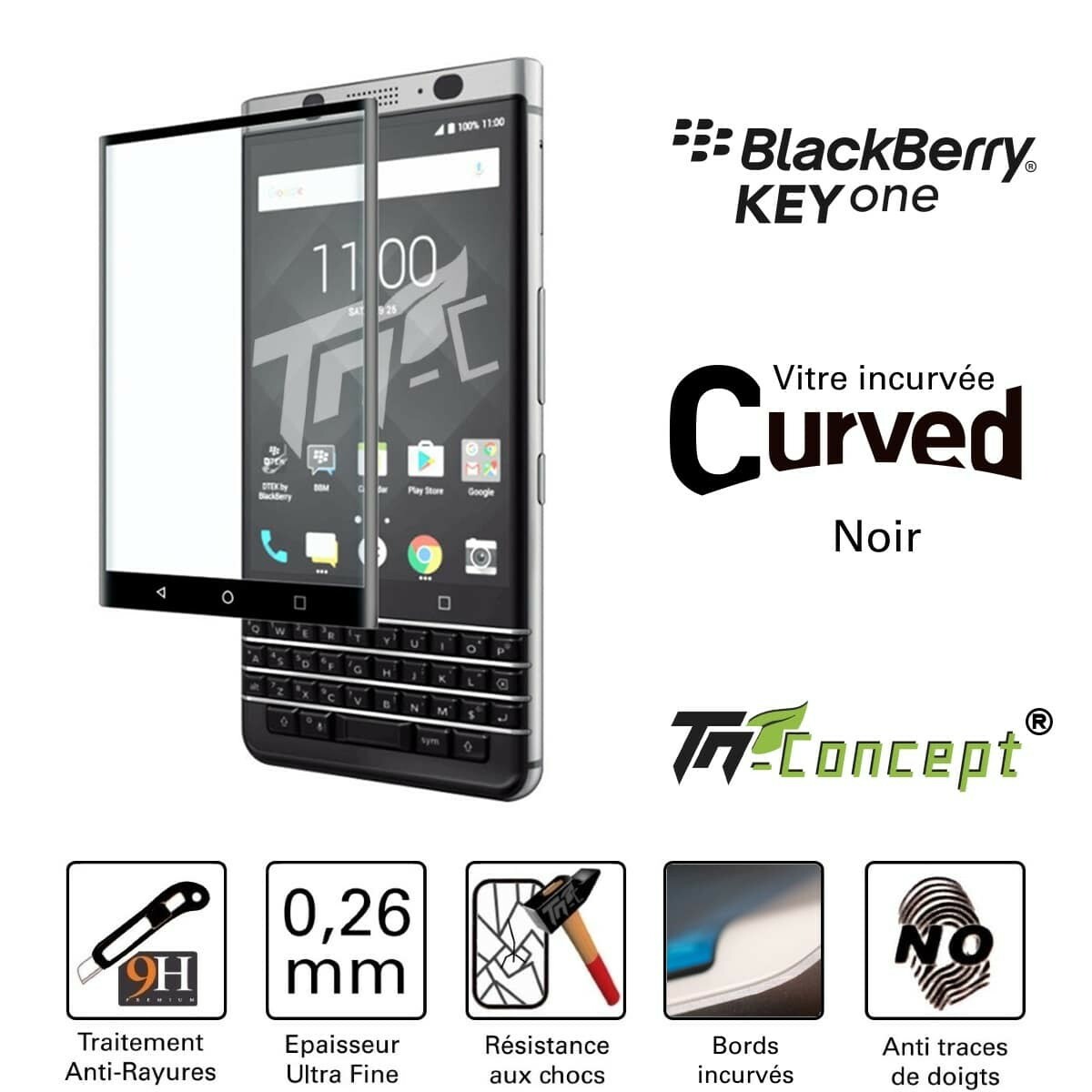 BlackBerry KEYone. Vitre Curved (verre trempé incurvé). III - CONTENU DANS LE BOITIER TM CONCEPT. Vitre incurvée en verre trempé. Vitre en verre trempé Qualité AAA : HD Transmittance - Origine Japon ou Corée du Sud.
