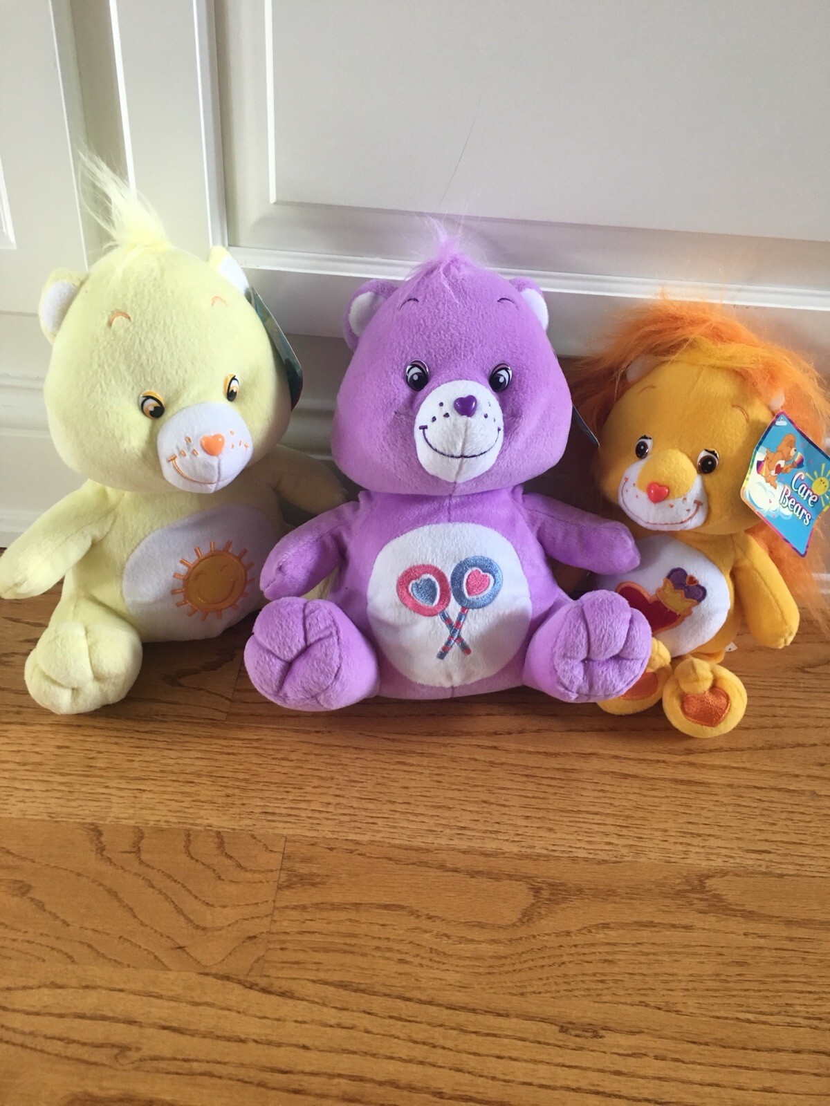 You are buying three 2003 Care Bears Plush toys. Bears included are Funshine, Share, & Brave Heart Lion Bears. All bears are New With Tags. All bears are clean and come from a smoke free Home. This item ships free. Thanks for checking out my item.