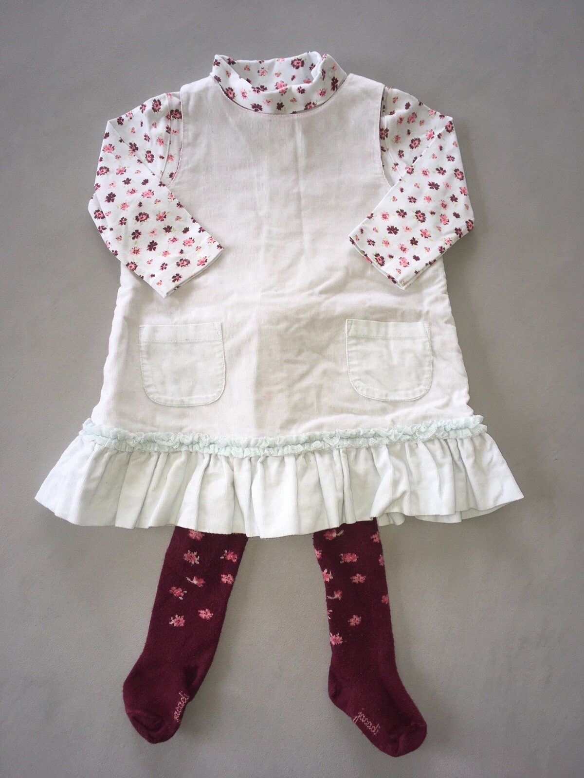 @ une paire de collant bordeaux avec motifs fleurs et Jacadi inscrit sous les pieds. @ un sous-pull extensible bleu ciel imprimé liberty avec col, pressionné sur l épaule TBE.