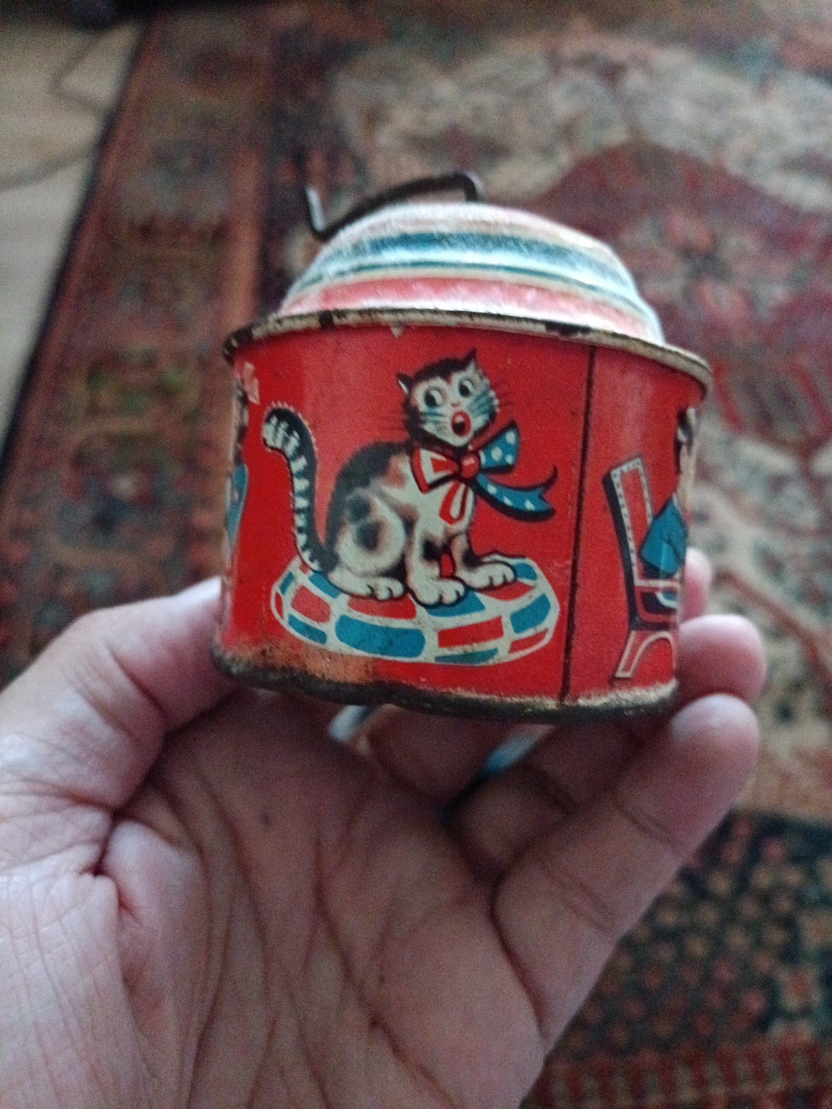 Jouet ancien Boite à musique Moulin musical,Lithographié Musicien,Chanteuse,Chat. Pas de PayPal Retour possible