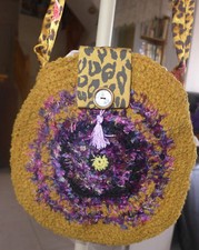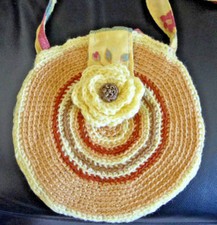 SAC ROND FAIT MAIN. ROND RAYURES MANDELLA PATTERN. Un bouton spécial fabriqué à la main. AVANT CROCHÉ EN LAINE GRIS JAUNE BEIGE. ET OR SATTIN RIBBON. AVEC UN GRAND BOUTON BEUTIFULL.