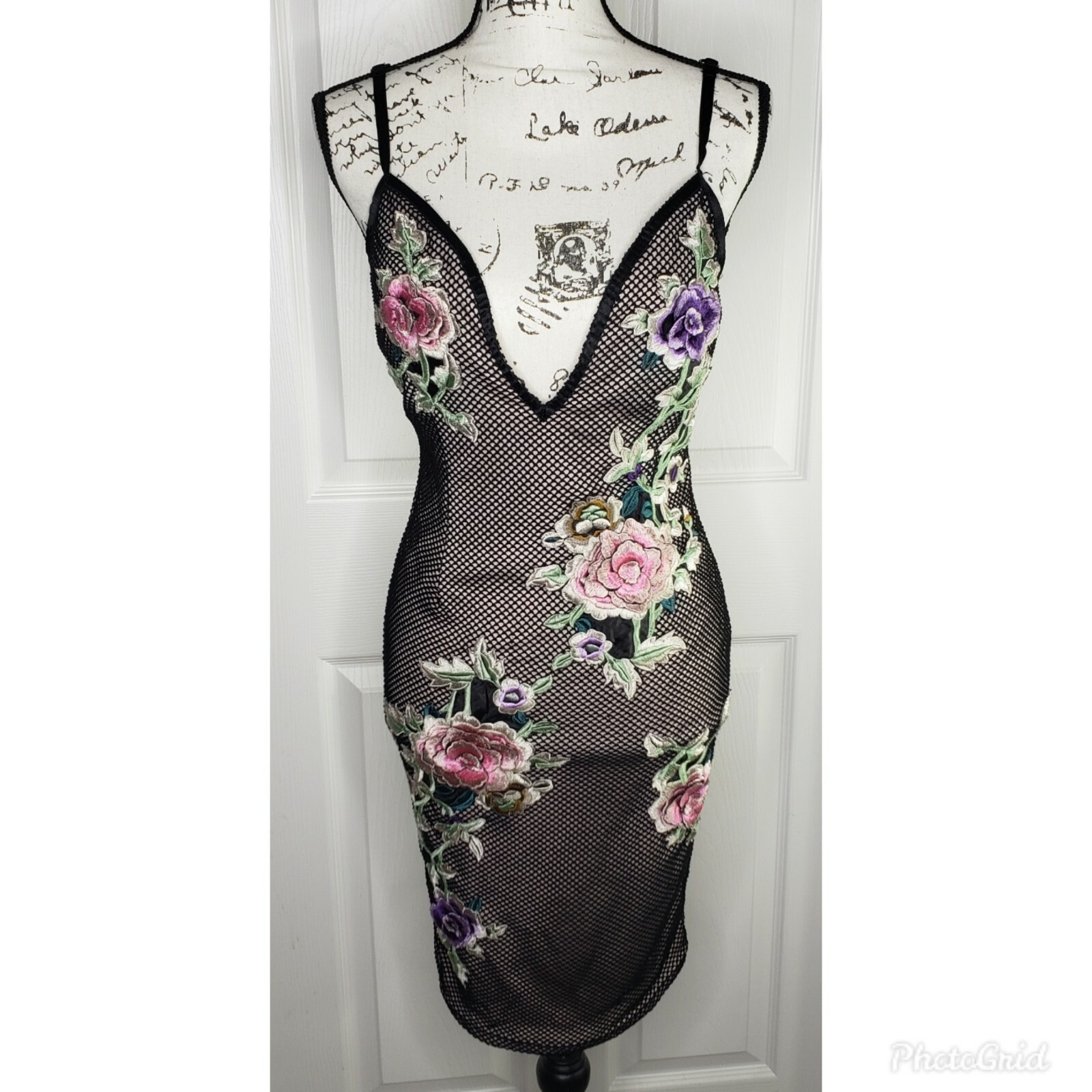 NWT L’ATISTE By Amy Embelished Dress Open Back with Back Zipper Closure. Color : Flesh color underlining with Black Netting and Multi-Color 3D Embroidered Florals. Padded Chest with a Deep V Dippin the front.