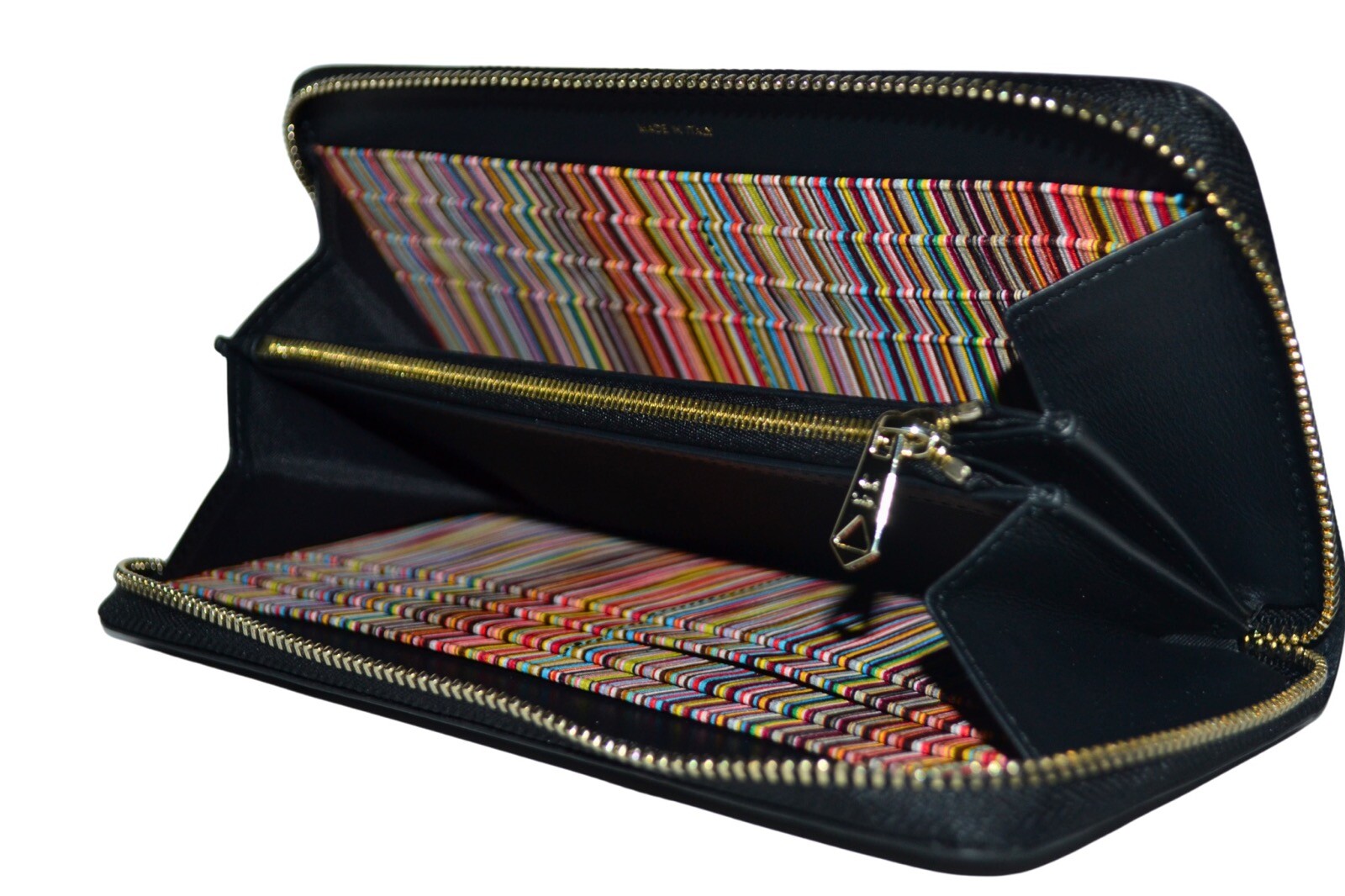 Paul Smith Portefeuille zippé en cuir pour hommes Intérieur rayé emblématiqueCe superbe portefeuille fabriqué en Italie est fabriqué à partir de cuir de veau noir lisse et doux, doté d'un trois quarts (zip sur 3 côtés avec une tirette griffée), et j'ai terminé avec un logo Signature en relief en feuille d'orDoublé dans le coloris classique Signature Stripe, en cuir et en tissu, ce portefeuille contient 12 poches pour cartes, 2 poches dissimulées et une poche zippée/pièce de monnaie centralisée.Dimensions (environ) plié 19 cm x 10,5 cm x 2 cmComposition-100% cuir de veauFabriqué en ItaliePrésenté dans un coffret cadeau noir de la marque Paul SmithTout neuf Produit Paul Smith authentique garanti expédié dans le monde entierCliquez sur le lien ci-dessous pour consulter notre boutique, mise.