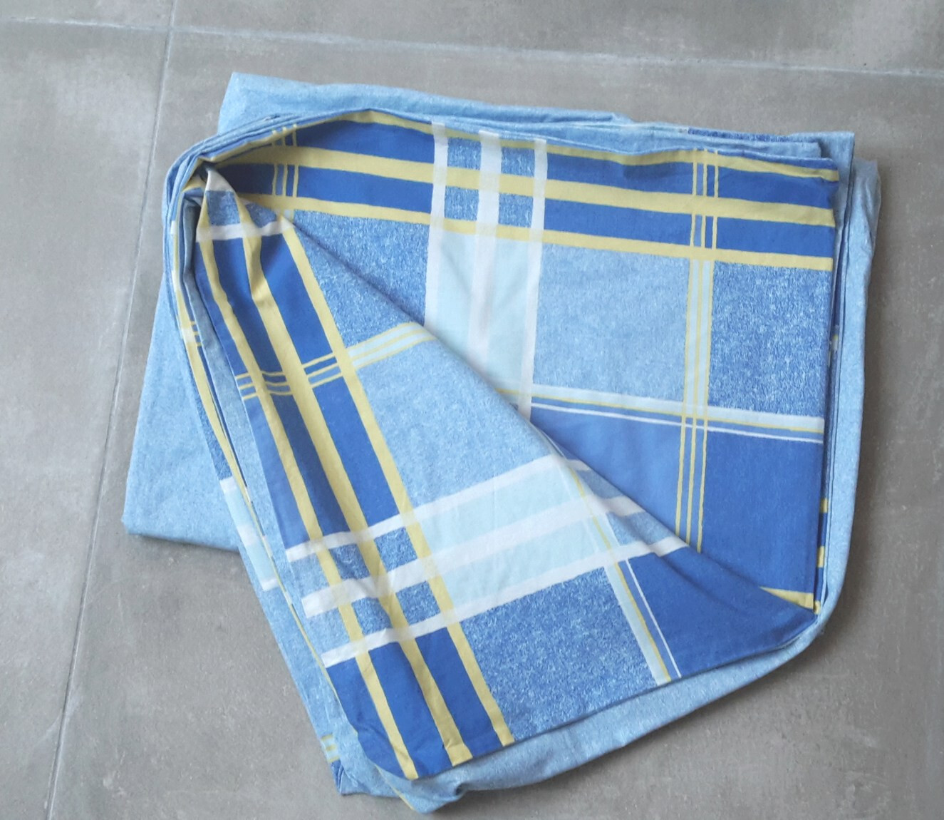 Housse de couette pour lit 1 personne bleue et jaune unie d'un côté et carreaux