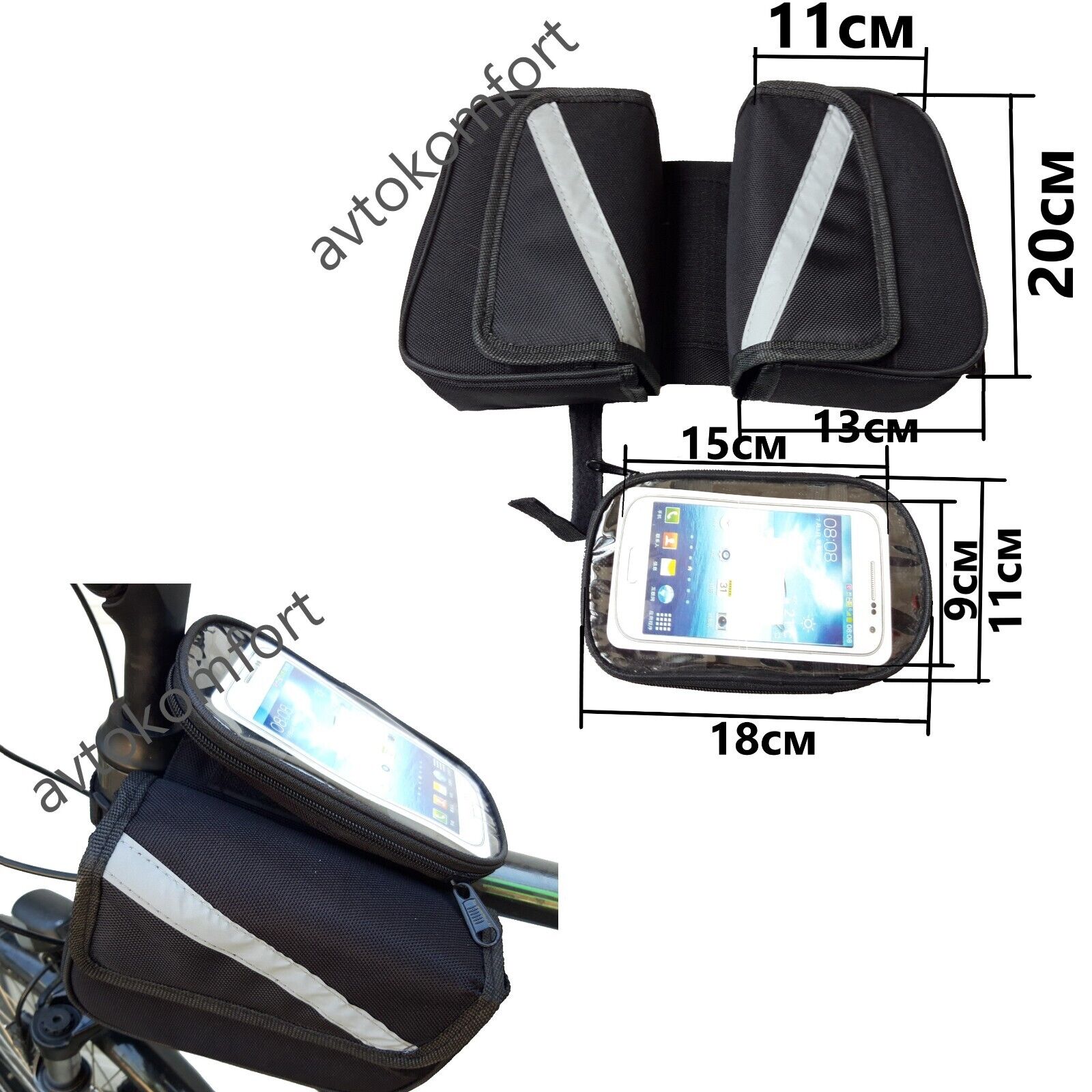 Cadre avant sac de vélo étanche vélo vélo haut Tube pochette support pour téléphone VTT. Bandes réfléchissantes de grande surface conçues des deux côtés, conduite plus sûre la nuit et plus à la mode.