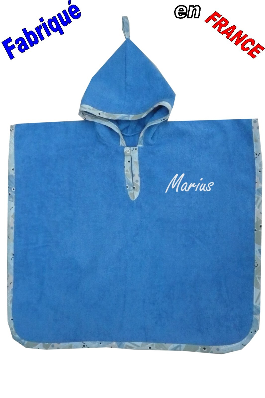 Eponge bleu nattier de belle qualité 400 grs au m². Poncho à capuche. Entreprise existant depuis 1989. Finitions soignées. Taille 7/8 ans: largeur 80 cms longueur 2x78 cms. Taille 5/6 ans: largeur 70 cms longueur 2x70 cms.