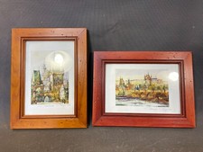 Lot de 2 anciens cadres photo en bois muraux avec vitre et illustrations 1950