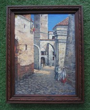 Ancien très beau tableau signé Paris rue Galande huile sur toile vers 1940.