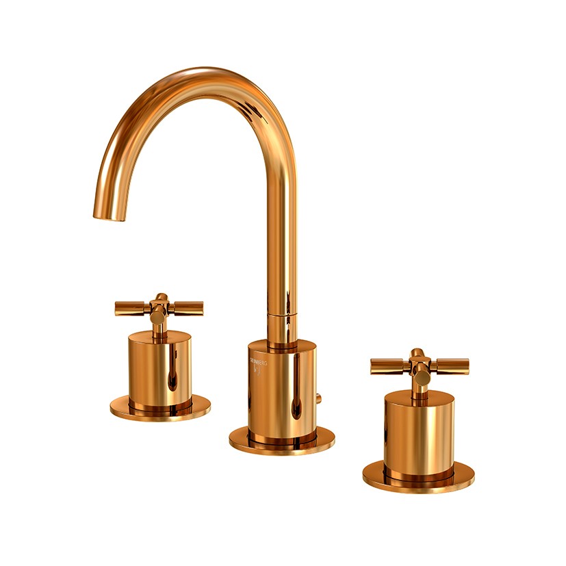 Robinet de lavabo Steinberg série 250, pivotant, 3 trous, avec vidange, largeur 150 mm, 2502000RG, couleur : or rose. Steinberg Série 250. bec pivotant. Robinet à deux poignées avec vannes d'eau chaude et froide à 90°.