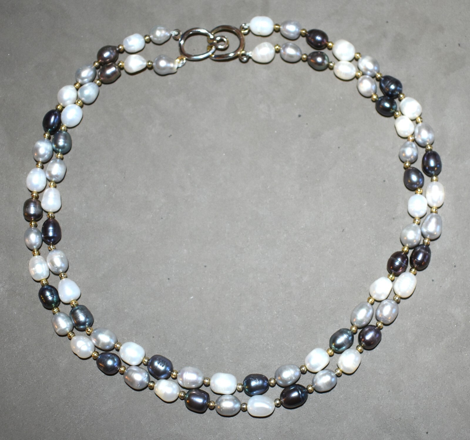 Très beau collier double rang en véritable perles de culture. Perles d'eau douce (je pense). Diamètre perles environ 0,7 cm, 0,8 cm perles irrégulières.