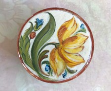 Enbois lisse verni. Envoitrès soigné. Poids : 58g. diamètre à l’endroit le plus large de la boîte : 7 cm.