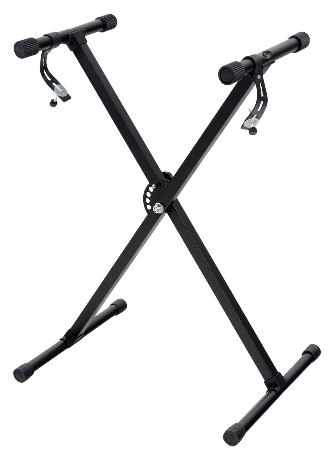 Support très léger pour claviers et synthétiseurs, Réglable en hauteur sur 7 positions de 29 à 85 cm, Sangles de fixation avec vis, Manchons en caoutchouc antidérapants, Pliable pour un gain de place.