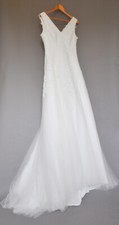 Robe de mariée T42 ivoire modele Melle Tania de PRONUPTIA forme sirène en crêpe fluide décolleté en V dos tulle transparent et perles boutonnage dos avec traîne. Style glamour chic. Essayage et retouches possibles dans un espace dédié alors n'hésitez pas à me contacter je vous recevrai avec grand plaisir ! État : Neuf avec étiquettes. le jupon est vendu séparément.