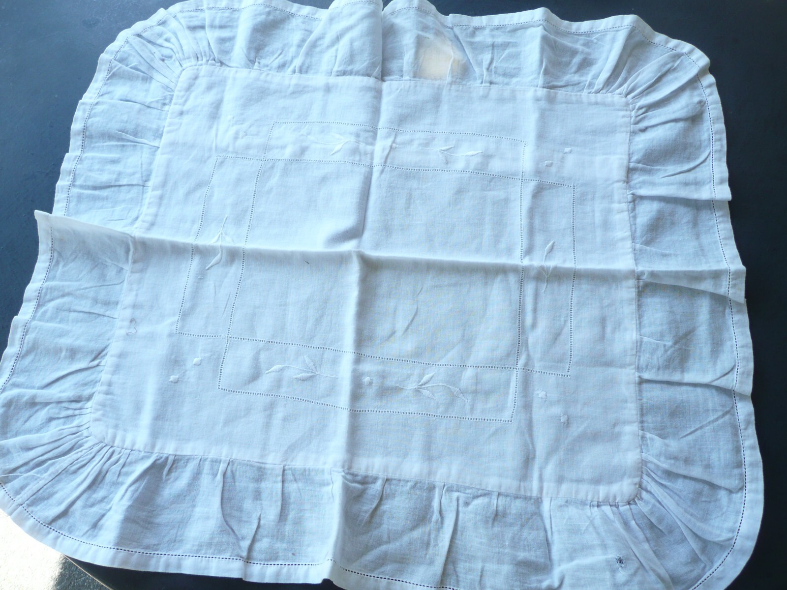 32,5 cm x 39 cm + volant de 8,5 cm. bon état mais à nettoyer ( petites taches à l'envers ). entourage volant.