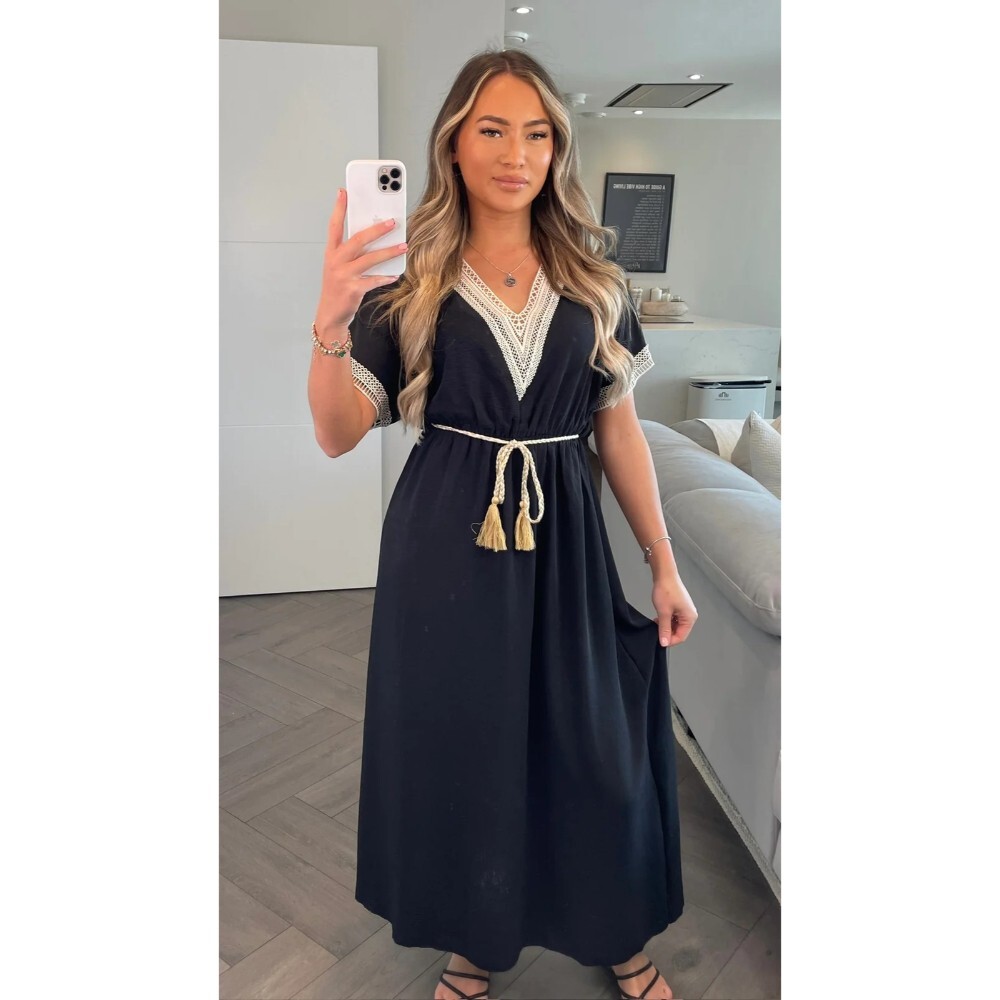 Présentant la robe maxi de cou de cou de cou au cou en V Broidered Aaliyah, dispose d'un décolleté en V, de la broderie style marocain sur le cou et les manches, ainsi qu'une ceinture à attacher à la taille. Idéal pour les vacances / nuits d'été ou les tenues d'été. Taille élastique Une taille unique s'adapte au Royaume-Uni 8-14.