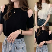T-shirt femme couleur unie épaules dénudées coupe slim manches courtes décon