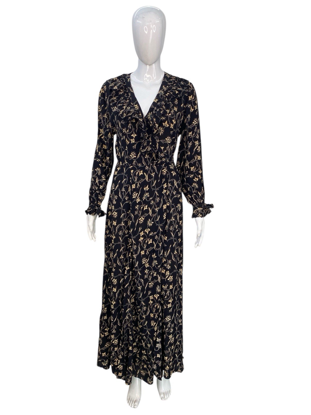 Robe Maxi Longue Noire Designer À Volants Imprimée Florale Pour Femmes M