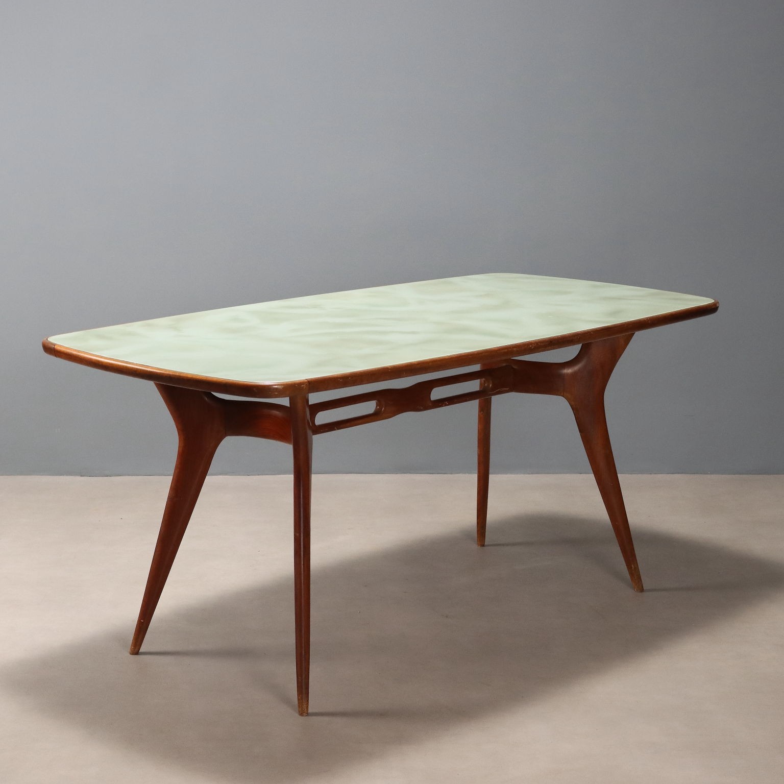 Table de Salle à Manger Vintage Hêtre Verre Design des Années 50-60 Originale. Table de salle à manger vintage avec pieds en bois de hêtre et plateau en verre traité rétro dans des tons de vert.