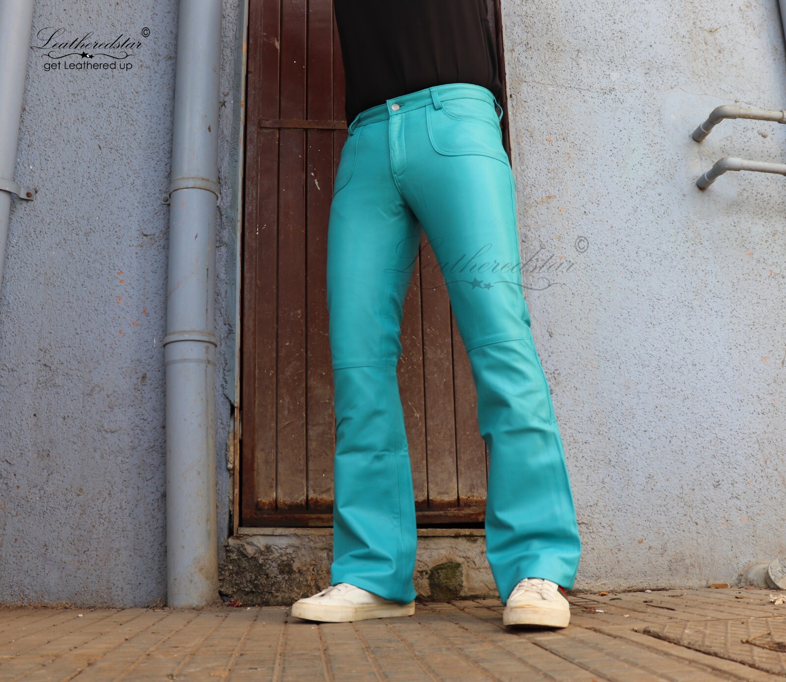 Jean en cuir torquise à fond évasé style 517 bootcut années 70 poche plaquée