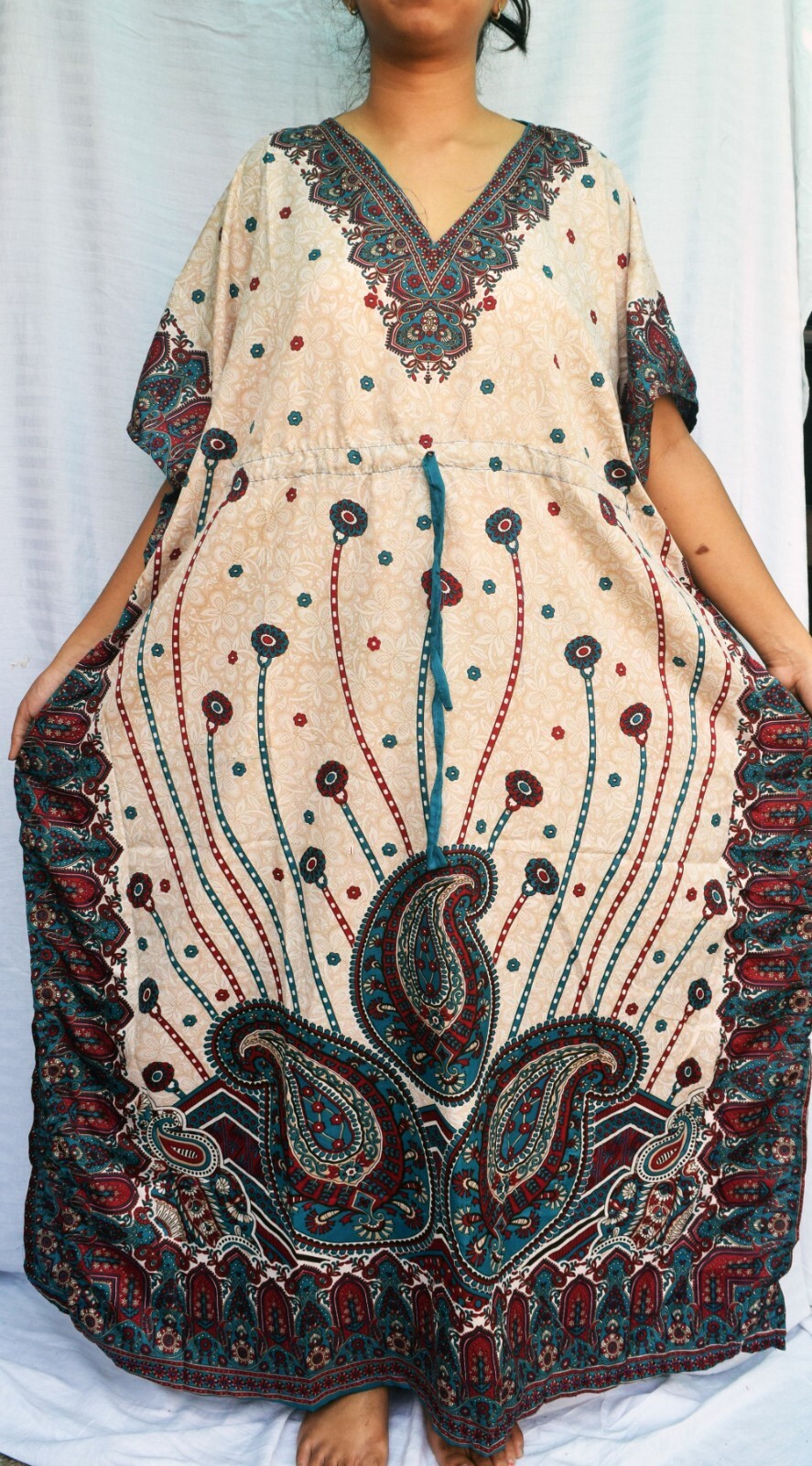 Ce beau caftan fait main est parfait pour toutes les occasions. La robe présente un motif cachemire vibrant et un décolleté en V flatteur. La robe est faite de polyester de haute qualité et est lavable en machine pour un entretien facile.