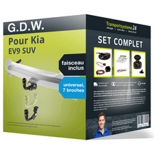 PACK COMPLET pour Kia EV9 SUV 06.2023 - à ce jour, composé d'un attelage col de cygne Auto Hak et d'un faisceau 7 broches Spécifique au véhicule TowTec. D’autres informations produit importantes consultables dans la notice de montage - veuillez cliquer sur le lien!.