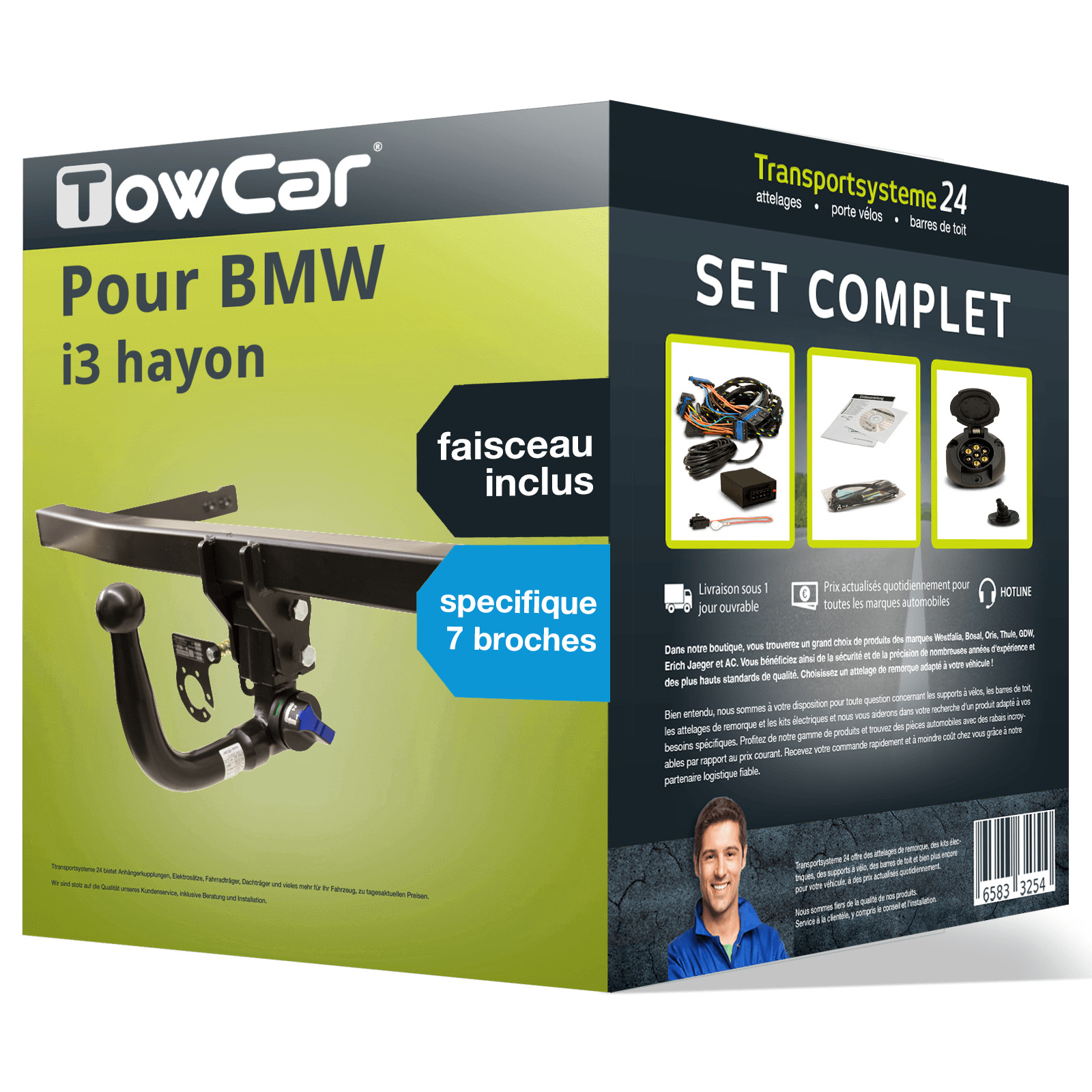 PACK COMPLET pour BMW i3 hayon 08.2013 - à ce jour, composé d'un attelage rotule démontable TowCar et d'un faisceau 7 broches Spécifique au véhicule TowTec. D’autres informations produit importantes consultables dans la notice de montage - veuillez cliquer sur le lien!.