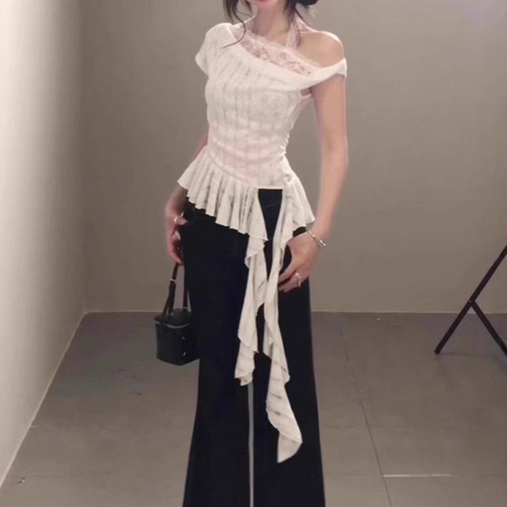 T shirt femme manches courtes dentelle irrégulière épaules dénudées décont